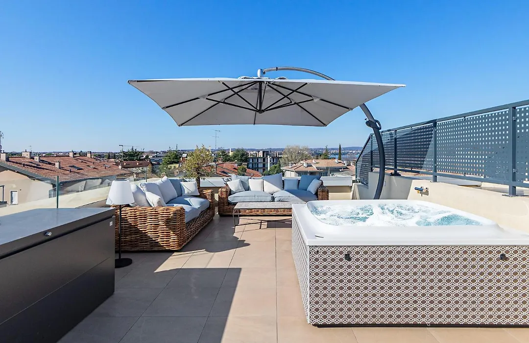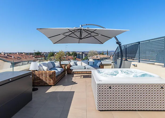 A 85 m²-es Neue Penthouse Wohnung Mit Whirlpool Und Garage Desenzano del Garda kényelmes közelségben van olyan városi látnivalókhoz, mint a nagyjából 5 perc sétára található C+C Maxigross. Az apartmanhoz terasz is tartozik, amely hegyre néző kilátással büszkélkedhet.